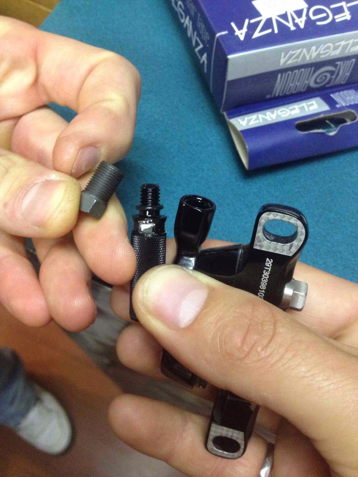 See on the left, a standard compression nut is fine threaded. In the middle is the coarse threaded Connectamajig, and the right is the banjo it goes into attached to the rear calliper.